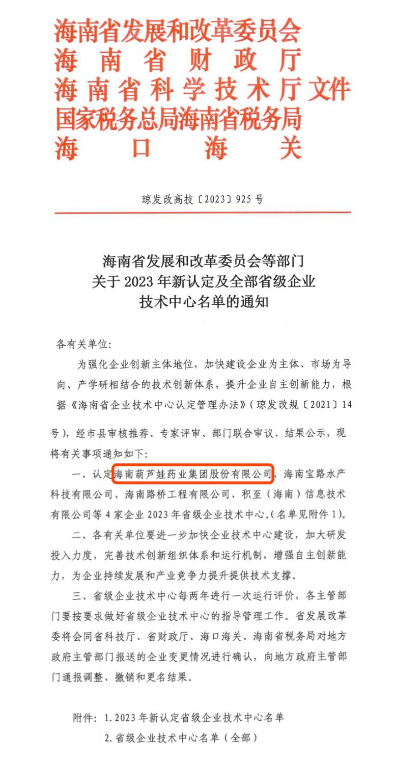 近日,海南省发改委等多部门联合公布了《关于2023年新认定及全部省级企业技术中心名单的通知》,其中,海南东升国际药业集团股份有限公司成功通过评审,被认定为省级企业技术中心,是本次获批的4家企业之一。